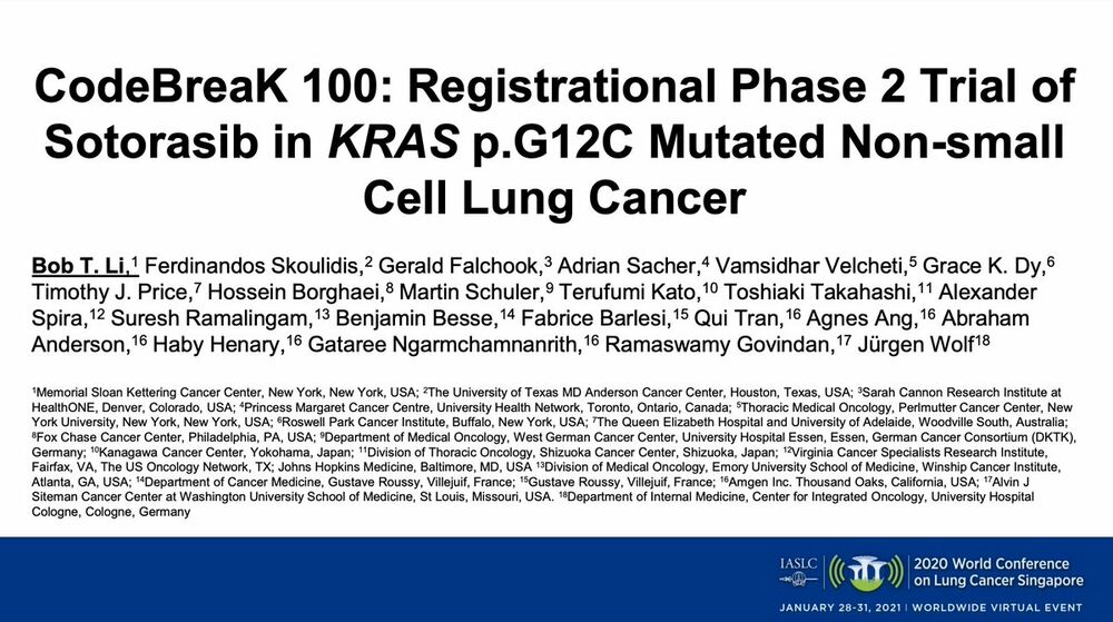 In the Phase II CodeBreak 100 study, sotorasib has shown clinically durable benefit with a favorable adverse event profile in patients with KRAS p.G12C mutations who have previously received up to 3 treatments for NSCLC. At ESMO 2020, sotorasib surprised in the phase I study and in his presentation at the WCLC 2020 Presidential Symposium, Dr Bob Li of Memorial Sloan Kettering Cancer Center presented positive phase II results.