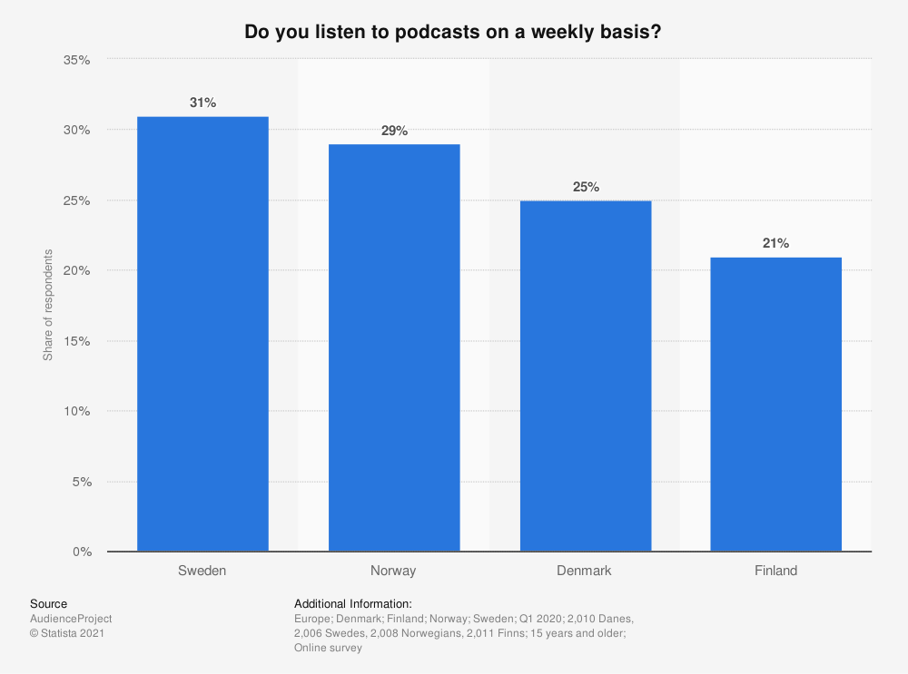 In the Nordic countries, Sweden is the country with the highest proportion of people listening to podcasts at least once a week. [3]