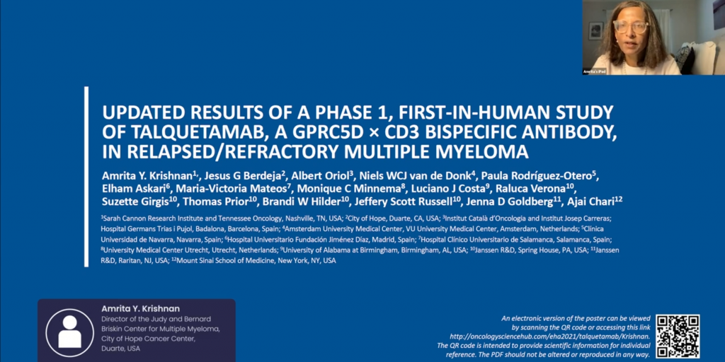 Talquetamab is a bispecific immunoglobulin G4 antibody that binds to CD3 and the novel target GPRC5D to redirect T cells to kill Multiple Myeloma cells. In this MEDtalk, Amrita Krishnan, director of the Judy and Bernard Briskin Center for Multiple Myeloma, City of Hope Cancer Center, Duarte, USA; present promising efficacy and safety data from the first in humanstudy. The study shows, that Talquetamab, have a high clinical response rate and was well-tolerated in patients with relapsed/refractory MM.